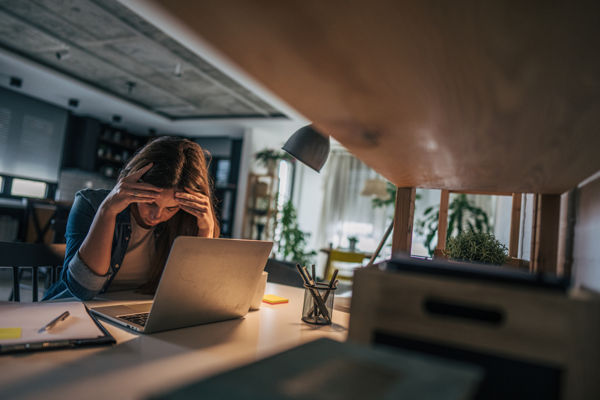 失败的女商人在夜晚的办公室加班.