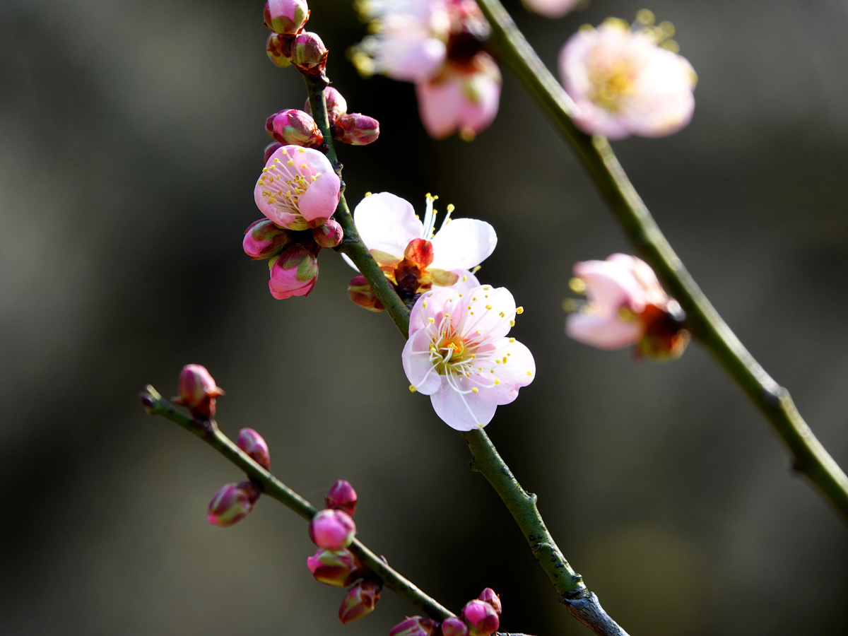 春日拍摄技巧|这个粉红梅花一朵盛开一朵含苞