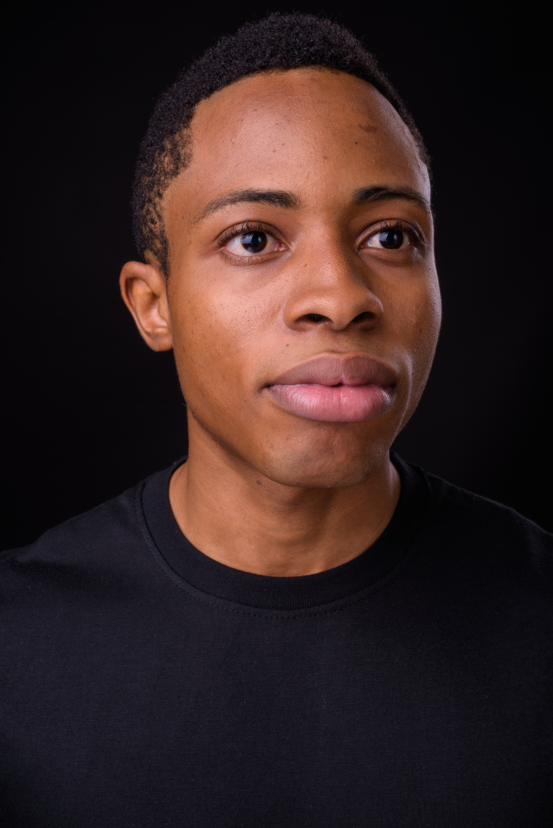 年轻英俊的美国黑人忧郁的男孩,穿着白色夹克,戴着眼镜,背景是黑色